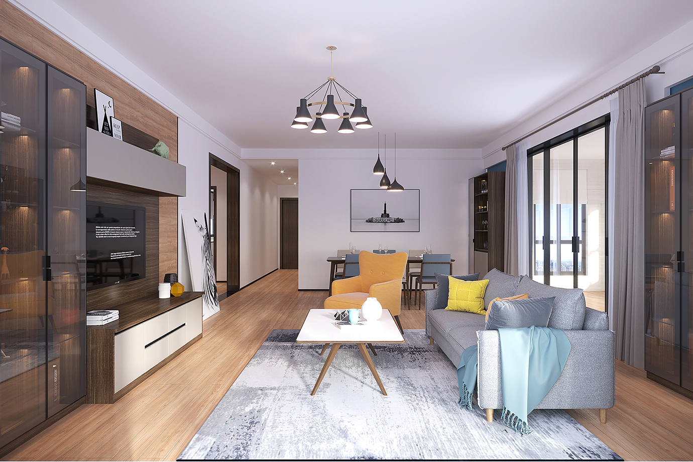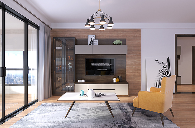 电视柜简洁大气,高级灰做底面,低调轻奢。铝框玻璃门的展示设计,足够的收纳位置,让空间充分利用,视觉感充实;色调明亮分明,更添低调内敛。